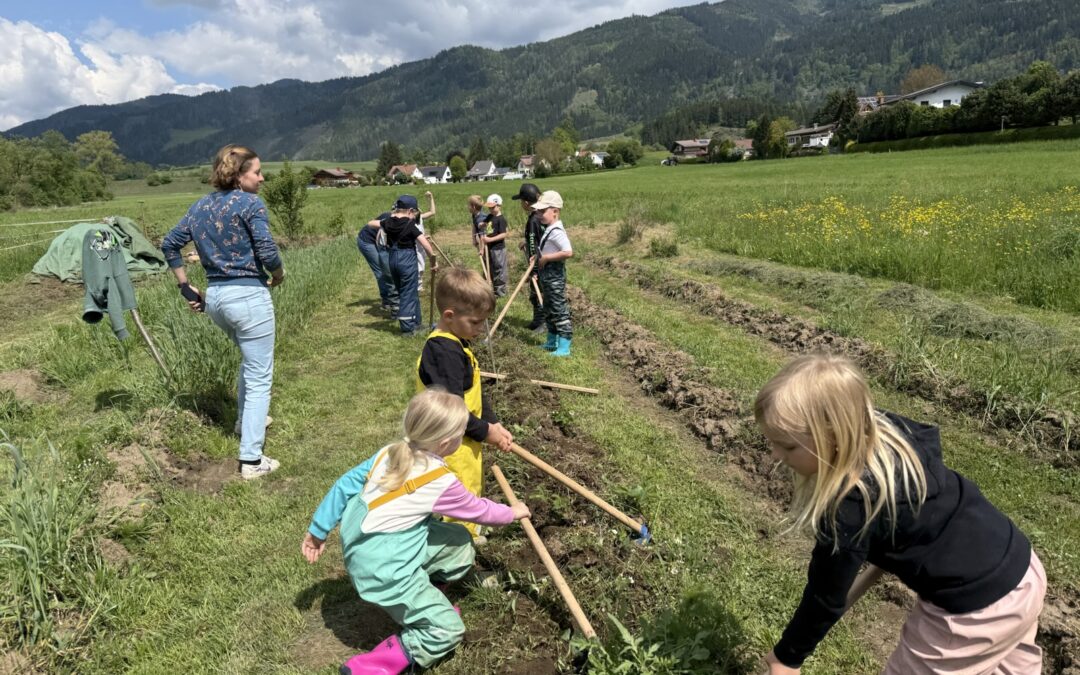 Die Kinder des Pfarrkindergartens in Pöls bei den ersten Arbeiten im Frühling im Gemeinschaftsgarten